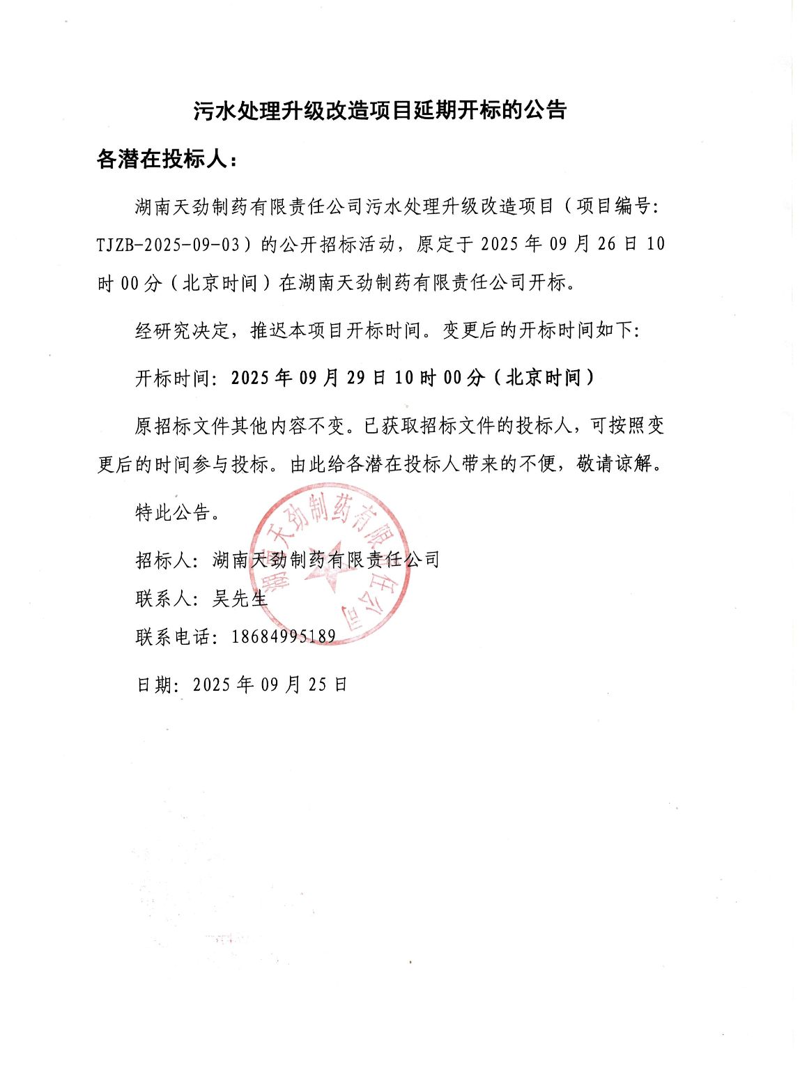 湖南天勁制藥有限責任公司污水處理升級改造項目中標候選人公示
